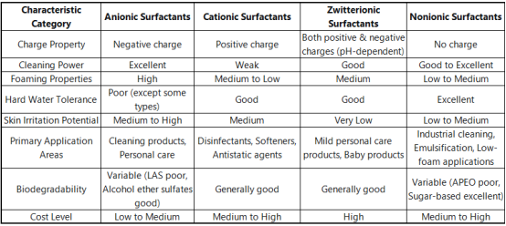 Picking the appropriate surfactant requires consideration of numerous variables, consisting of application needs, cost, ecological conditions, and governing requirements. The following table summarizes the vital features of the four main surfactant categories: